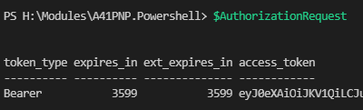 If we run follwing script afterwards, we will notice, that the $AuthorizationRequest will show us a token with an bearer token.