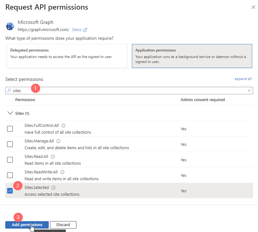 - You need your global administrator in your organization to grant the sites.selected permission for an Azure Enterprise Application