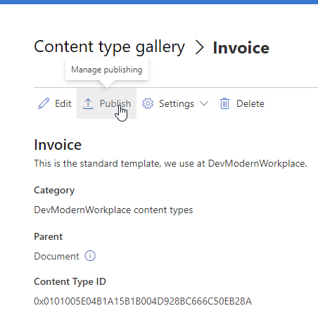 I chose to locate my content type invoice in the new category “DevModernWorkplace” category. You can also use the exisiting category document content types category. I would recommend a new category, so you see all your custom content types at one place.