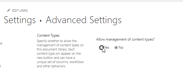 Set Allow management of content types? to Yes, scroll down to “Ok” to save your settings.