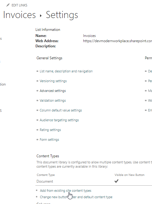I have added the meta data due date from the existing site columns and added invoice date as new site columns and added the new site column to the new dedicated category “Invoice Columns”.
